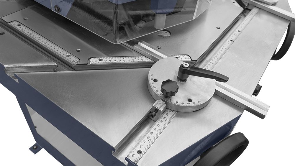 Stół roboczy: Powiększony, z naniesionymi skalami i regulowanymi odbojami z solidnymi rączkami zaciskowymi. Nie trzeba wyciągać miarki zwijanej przed każdym cięciem.